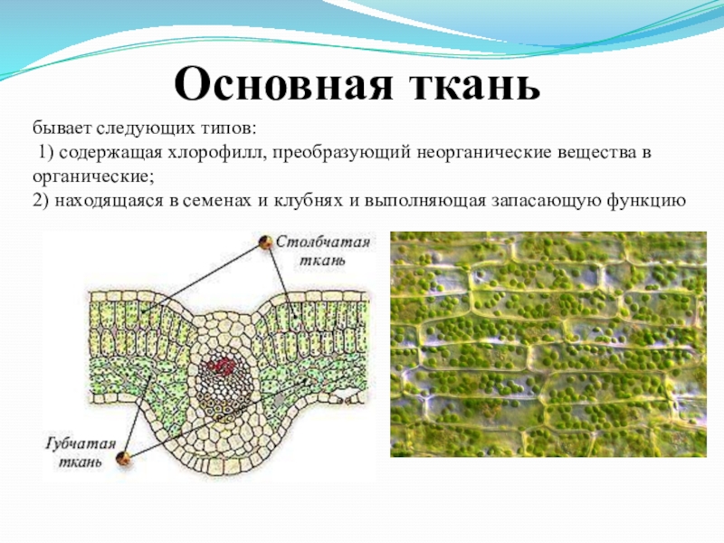 Основная ткань бывает следующих типов: 1) содержащая хлорофилл, преобразующий неорганические вещества в органические; 2) находящаяся в семенах