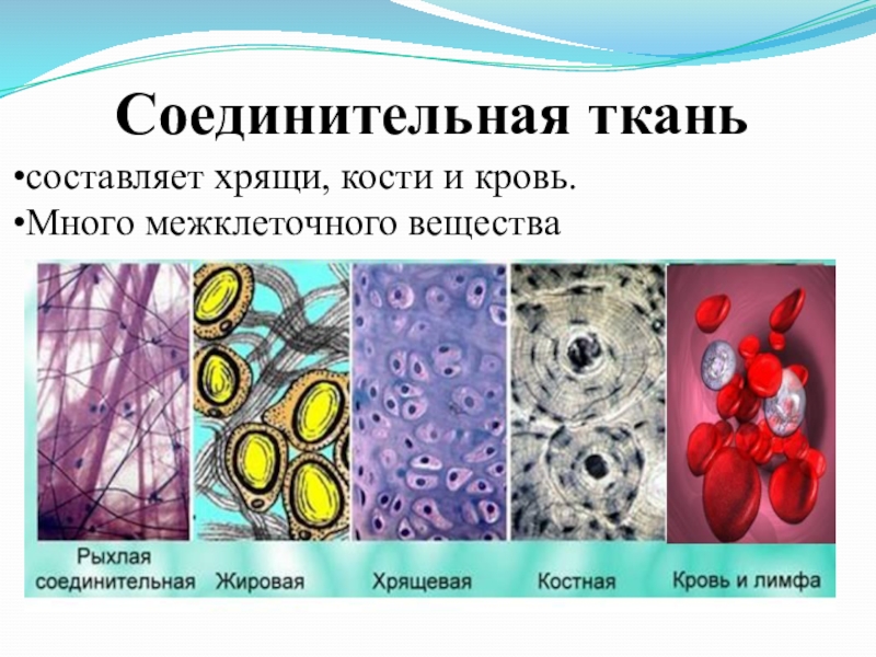 Соединительная ткань составляет хрящи, кости и кровь.Много межклеточного вещества