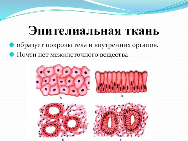 Эпителиальная ткань образует покровы тела и внутренних органов.Почти нет межклеточного вещества