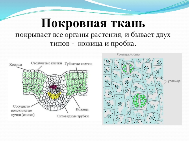 Покровная ткань покрывает все органы растения, и бывает двух типов - кожица и пробка.