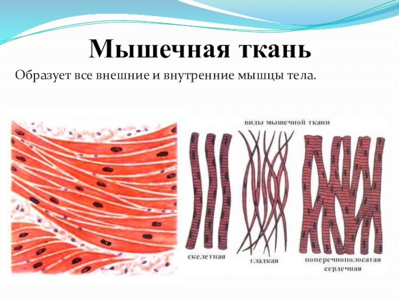 Мышечная ткань Образует все внешние и внутренние мышцы тела.