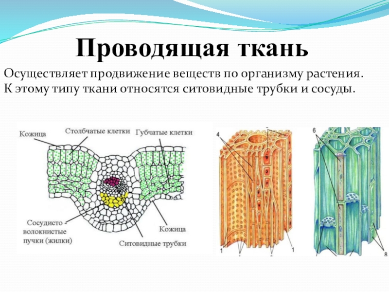 Проводящая ткань Осуществляет продвижение веществ по организму растения. К этому типу ткани относятся ситовидные трубки и сосуды.