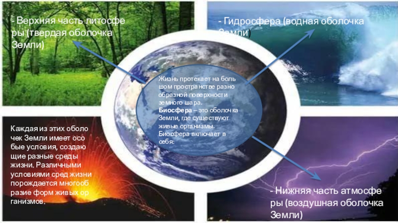 Каждая из этих оболочек Земли имеет особые условия, создающие разные среды жизни. Различными условиями сред жизни порождается многообразие форм живых организмов.