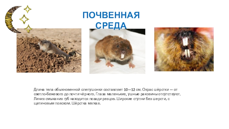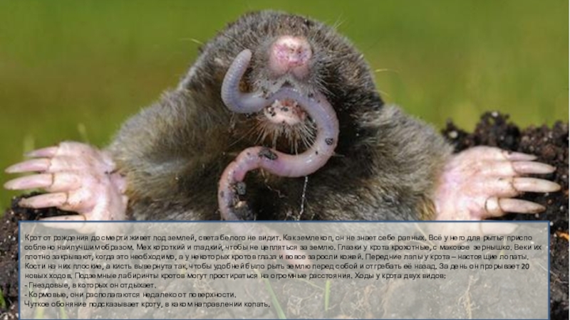 Строение тела крота, цокора и слепыша говорит о том, что все они обитатели почвенной среды. Передние ноги у крота и цокора – главный инструмент для рытья. Они плоские, как лопаты, с очень большими когтями. А у слепыша ноги обычные. Он вгрызается в почву мощными передними зубами. Тело у всех этих зверьков овальное, компактное, для более удобного перемещения по подземным ходам.