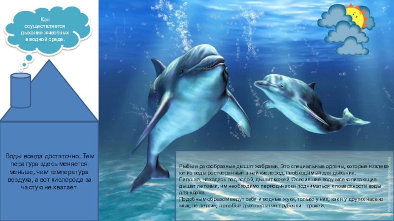 Лягушка, находясь под водой, дышит кожей. Освоившие воду млекопитающие дышат легкими, им необходимо периодически подниматься к поверхности воды для вдоха.