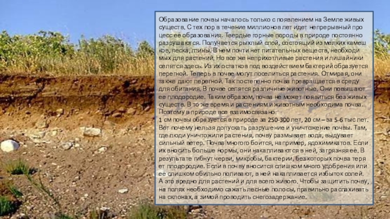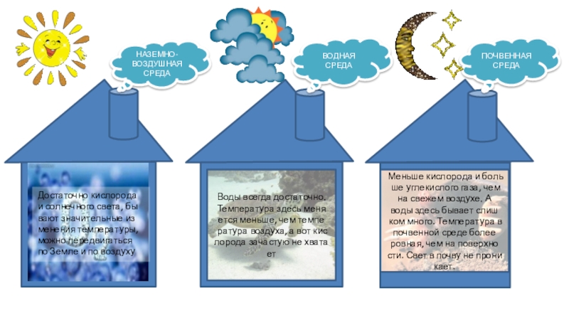 Меньше кислорода и больше углекислого газа, чем на свежем воздухе. А воды здесь бывает слишком много. Температура в почвенной среде более ровная, чем на поверхности. Свет в почву не проникает.