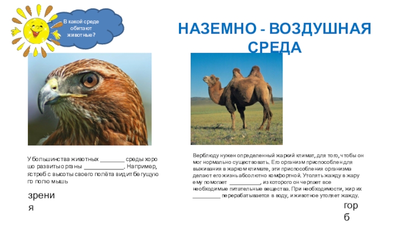 Верблюду нужен определенный жаркий климат, для того, чтобы он мог нормально существовать. Его организм приспособлен для выживания в жарком климате, эти приспособления организма делают его жизнь абсолютно комфортной. Утолять жажду в жару ему помогает ___________, из которого он черпает все необходимые питательные вещества. При необходимости, жир их __________ перерабатывается в воду, и животное утоляет жажду.