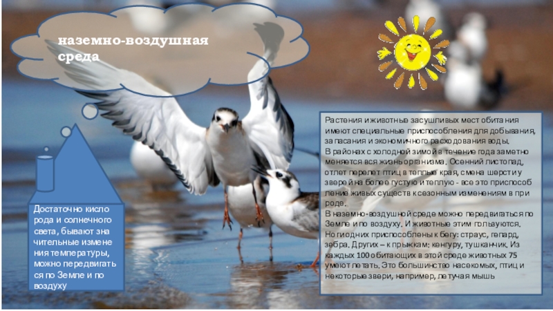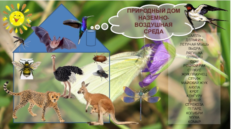 В наземно-воздушной среде можно передвигаться по Земле и по воздуху. И животные этим пользуются. Ноги одних приспособлены к бегу: страус, гепард, зебра. Других – к прыжкам: кенгуру, тушканчик. Из каждых 100 обитающих в этой среде животных 75 умеют летать. Это большинство насекомых, птиц и некоторые звери, например, летучая мышь