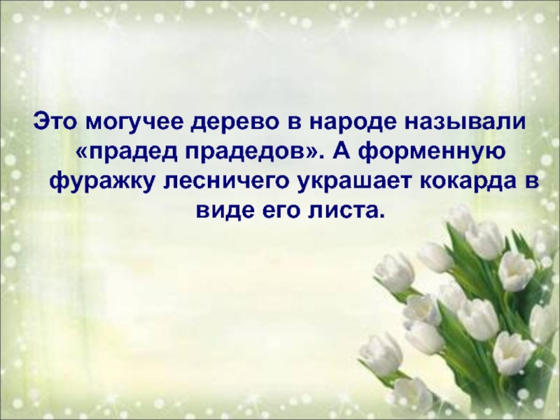 Слайд 21Это могучее дерево в народе называли «прадед прадедов». А форменную фуражку