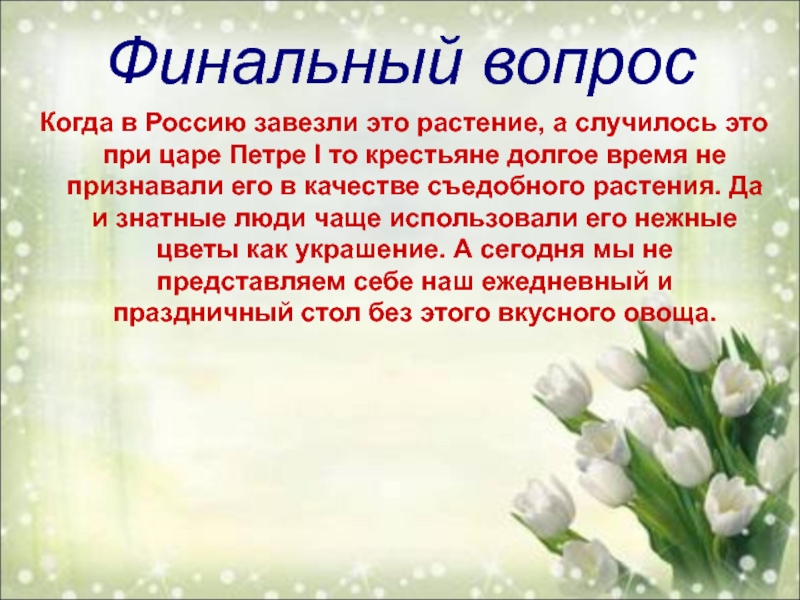 при царе Петре I то крестьяне долгое время не признавали его в качестве съедобного растения. Да и знатные люди чаще использовали его нежные цветы как украшение. А сегодня мы не представляем себе наш ежедневный и праздничный стол без этого вкусного овоща.