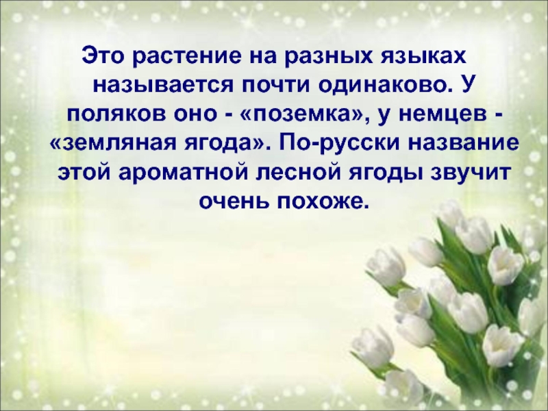 - «поземка», у немцев - «земляная ягода». По-русски название этой ароматной лесной ягоды звучит очень похоже.