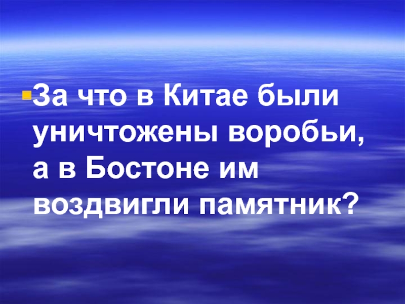 Слайд 15За что в Китае были уничтожены воробьи, а в Бостоне им