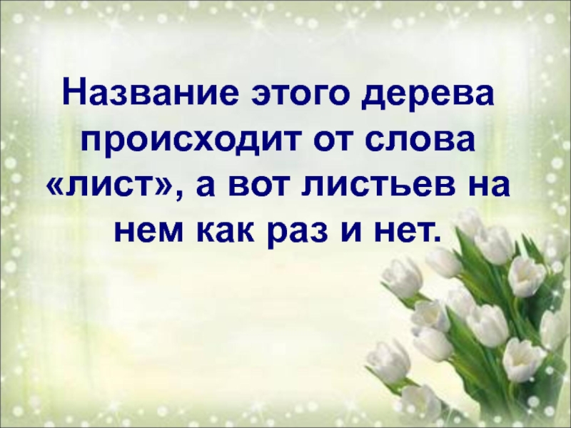 Слайд 9Название этого дерева происходит от слова «лист», а вот листьев на