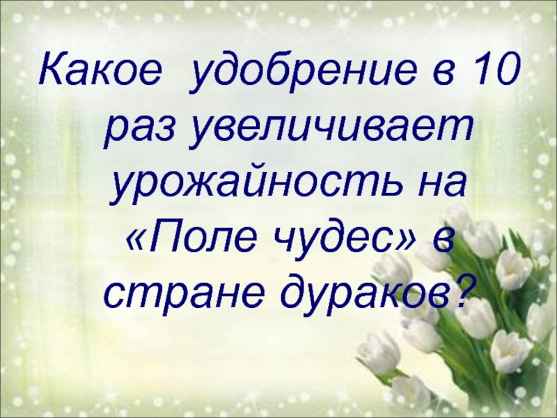 Слайд 35Какое удобрение в 10 раз увеличивает урожайность на «Поле чудес» в