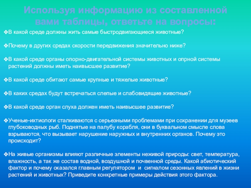 Слайд 15Используя информацию из составленной вами таблицы, ответьте на вопросы: