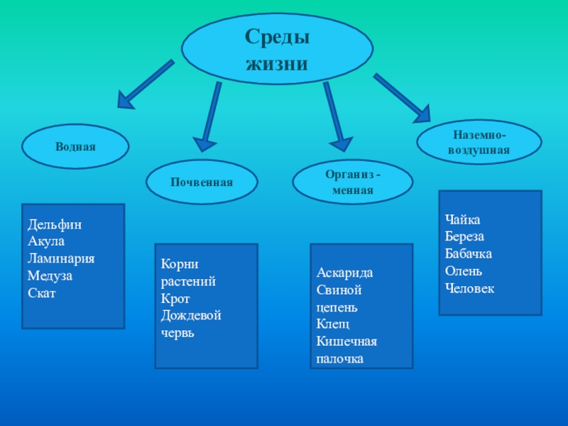 дельфин, чайка, акула, береза, комар, корень дерева, ламинария, крот, медуза, дождевой червь, бабочка, олень, кишечная палочка, волк, свиной цепень, человек, клещ собачий, скат.