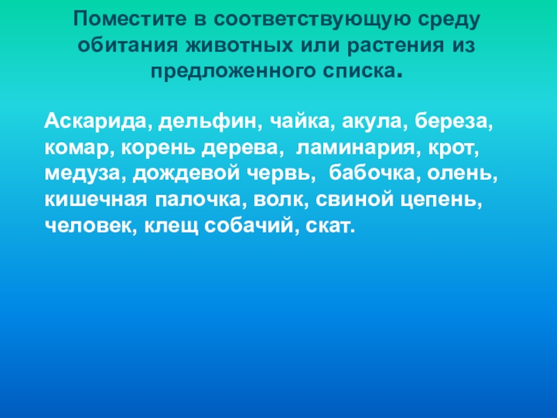 Слайд 10Поместите в соответствующую среду обитания животных или растения из предложенного списка.