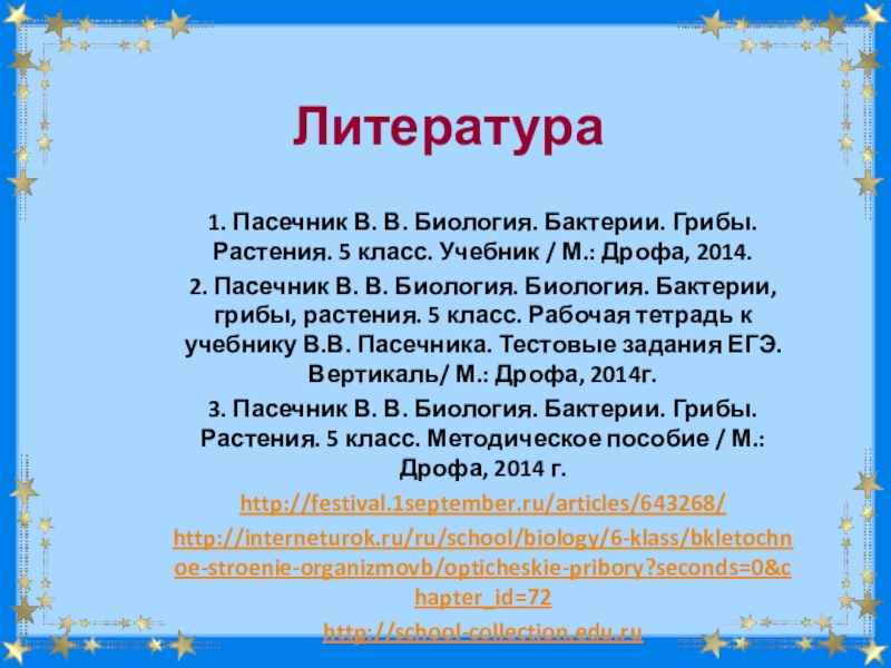 Литература1. Пасечник В. В. Биология. Бактерии. Грибы. Растения. 5 класс. Учебник / М.: Дрофа, 2014.2. Пасечник В.