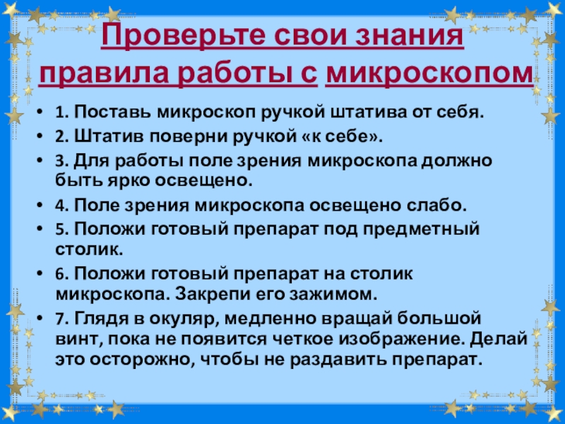 Слайд 10Проверьте свои знания правила работы с микроскопом