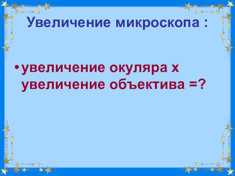 Увеличение микроскопа :увеличение окуляра x увеличение объектива =?