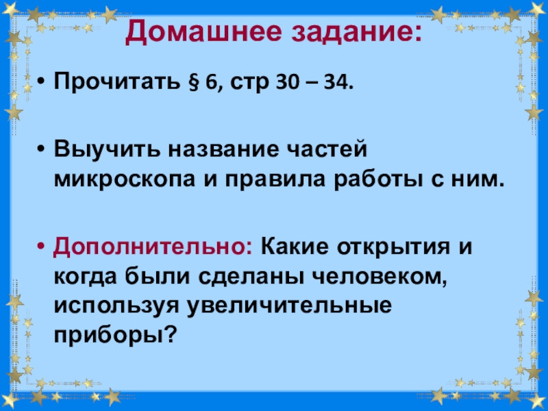 Домашнее задание:  Прочитать § 6, стр 30 – 34.Выучить название частей микроскопа и правила работы с