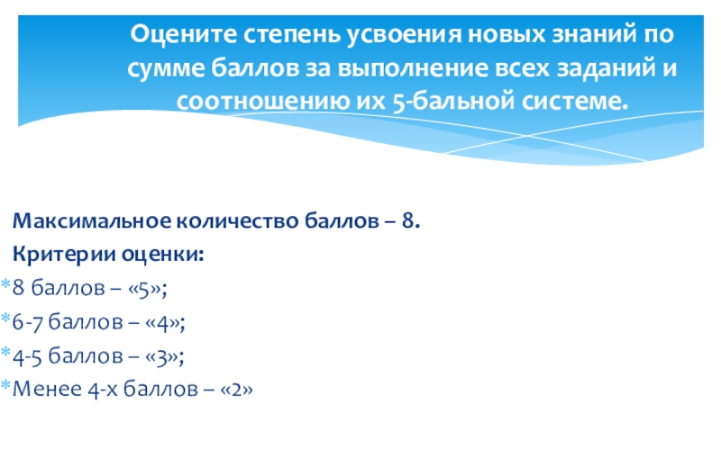 Оцените степень усвоения новых знаний по сумме баллов за выполнение всех заданий и соотношению их 5-бальной системе.