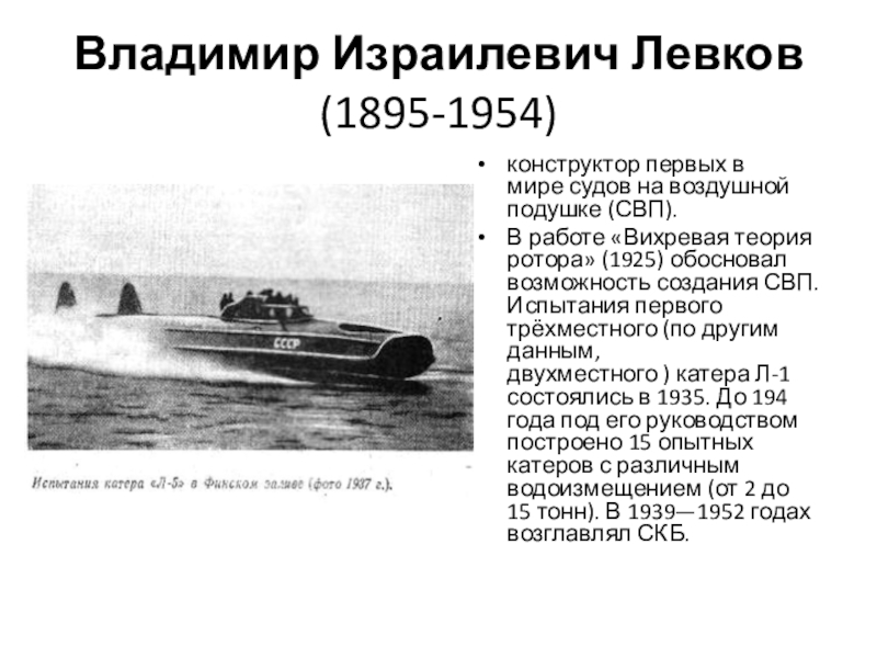 «Вихревая теория ротора» (1925) обосновал возможность создания СВП. Испытания первого трёхместного (по другим данным, двухместного ) катера Л-1 состоялись в 1935. До 194 года под его руководством построено 15 опытных катеров с различным водоизмещением (от 2 до 15 тонн). В 1939—1952 годах возглавлял СКБ.