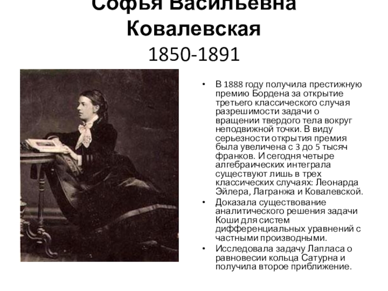 открытие третьего классического случая разрешимости задачи о вращении твердого тела вокруг неподвижной точки. В виду серьезности открытия премия была увеличена с 3 до 5 тысяч франков. И сегодня четыре алгебраических интеграла существуют лишь в трех классических случаях: Леонарда Эйлера, Лагранжа и Ковалевской.