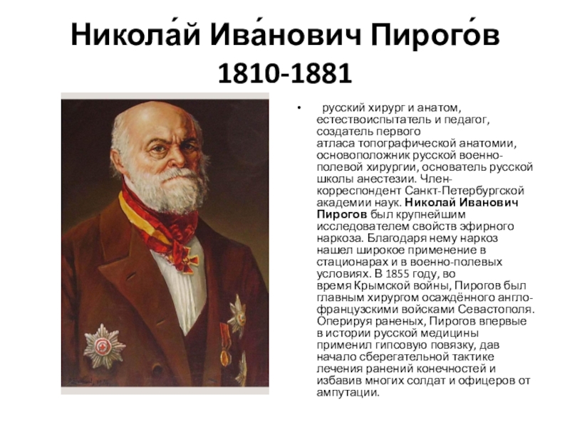 русской военно-полевой хирургии, основатель русской школы анестезии. Член-корреспондент Санкт-Петербургской академии наук. Николай Иванович Пирогов был крупнейшим исследователем свойств эфирного наркоза. Благодаря нему наркоз нашел широкое применение в стационарах и в военно-полевых условиях. В 1855 году, во время Крымской войны, Пирогов был главным хирургом осаждённого англо-французскими войсками Севастополя. Оперируя раненых, Пирогов впервые в истории русской медицины применил гипсовую повязку, дав начало сберегательной тактике лечения ранений конечностей и избавив многих солдат и офицеров от ампутации.
