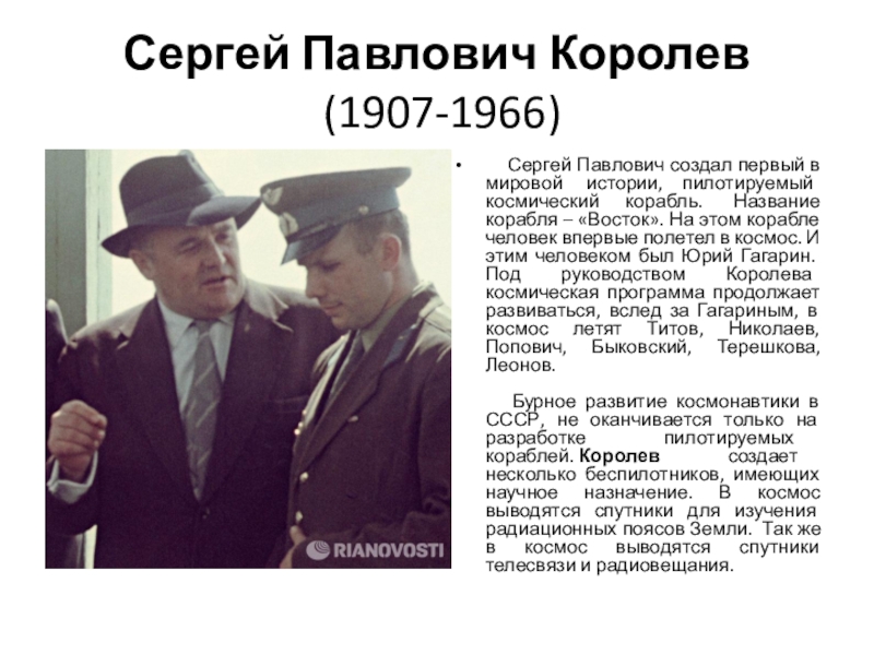космический корабль. Название корабля – «Восток». На этом корабле человек впервые полетел в космос. И этим человеком был Юрий Гагарин. Под руководством Королева космическая программа продолжает развиваться, вслед за Гагариным, в космос летят Титов, Николаев, Попович, Быковский, Терешкова, Леонов.