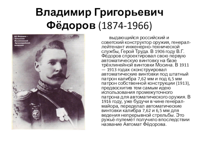 В 1906 году В.Г.Фёдоров спроектировал свою первую автоматическую винтовку на базе трёхлинейной винтовки Мосина. В 1911 — 1913 годах сконструировал автоматические винтовки под штатный патрон калибра 7,62 мм и под 6,5 мм патрон собственной конструкции (1913), предвосхитив тем самым идею использования промежуточного патрона для автоматического оружия. В 1916 году, уже будучи в чине генерал-майора, переделал автоматические винтовки калибра 7,62 и 6,5 мм для ведения непрерывной стрельбы. Это ружьё-пулемёт получило впоследствии название Автомат Фёдорова.