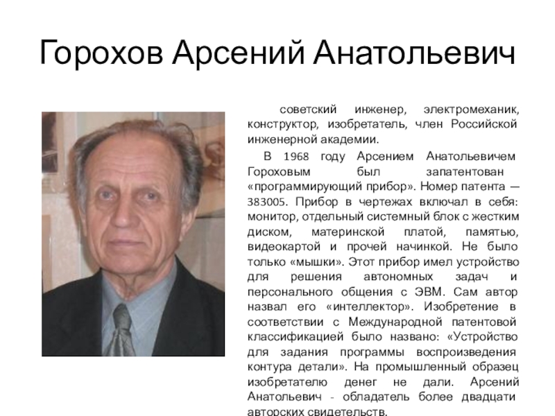 В 1968 году Арсением Анатольевичем Гороховым был запатентован «программирующий прибор». Номер патента — 383005. Прибор в чертежах включал в себя: монитор, отдельный системный блок с жестким диском, материнской платой, памятью, видеокартой и прочей начинкой. Не было только «мышки». Этот прибор имел устройство для решения автономных задач и персонального общения с ЭВМ. Сам автор назвал его «интеллектор». Изобретение в соответствии с Международной патентовой классификацией было названо: «Устройство для задания программы воспроизведения контура детали». На промышленный образец изобретателю денег не дали. Арсений Анатольевич - обладатель более двадцати авторских свидетельств.