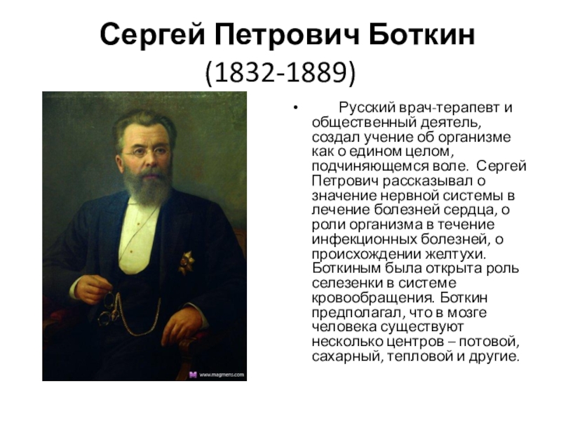 учение об организме как о едином целом, подчиняющемся воле. Сергей Петрович рассказывал о значение нервной системы в лечение болезней сердца, о роли организма в течение инфекционных болезней, о происхождении желтухи. Боткиным была открыта роль селезенки в системе кровообращения. Боткин предполагал, что в мозге человека существуют несколько центров – потовой, сахарный, тепловой и другие.