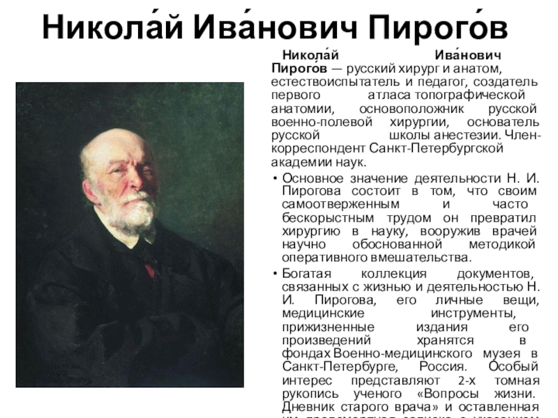 анатомии, основоположник русской военно-полевой хирургии, основатель русской школы анестезии. Член-корреспондент Санкт-Петербургской академии наук.