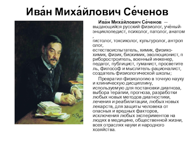 Ива́н Миха́йлович Се́ченов — выдающийся русский физиолог, учёный-энциклопедист, психолог, патолог, анатом, гистолог, токсиколог, культуролог, антрополог,