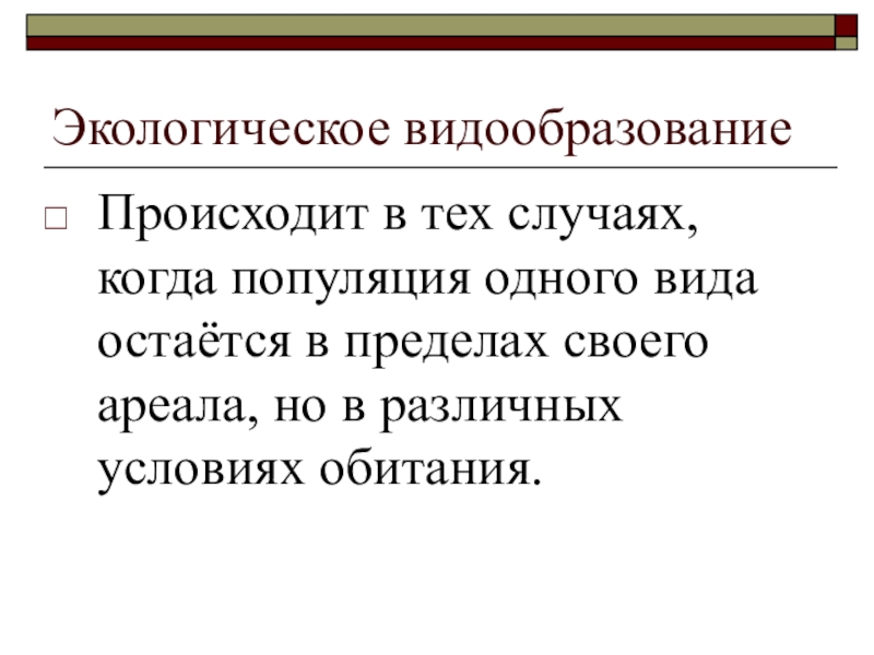 Экологическое видообразованиеПроисходит в тех случаях, когда популяция одного вида остаётся в пределах своего ареала, но в различных