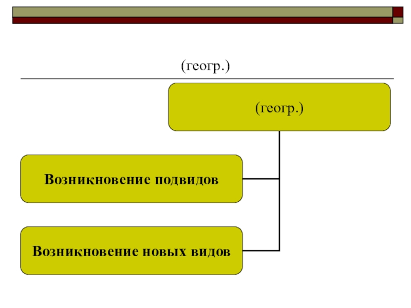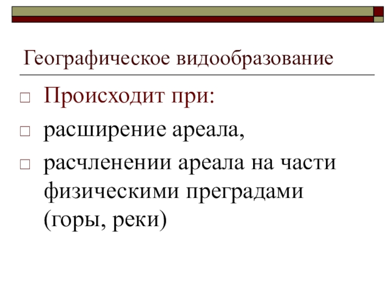 Географическое видообразованиеПроисходит при:расширение ареала,расчленении ареала на части физическими преградами (горы, реки)