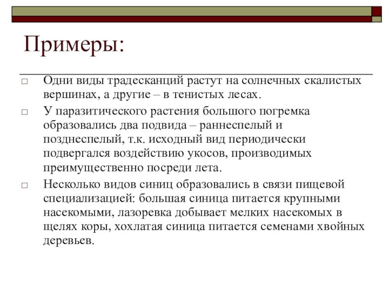 Примеры:Одни виды традесканций растут на солнечных скалистых вершинах, а другие – в тенистых лесах.У паразитического растения большого