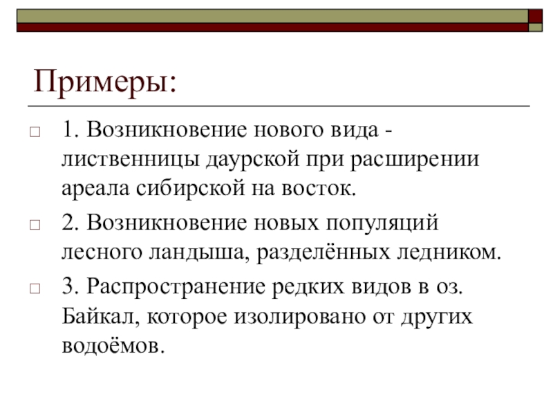 Примеры:1. Возникновение нового вида - лиственницы даурской при расширении ареала сибирской на восток.2. Возникновение новых популяций лесного