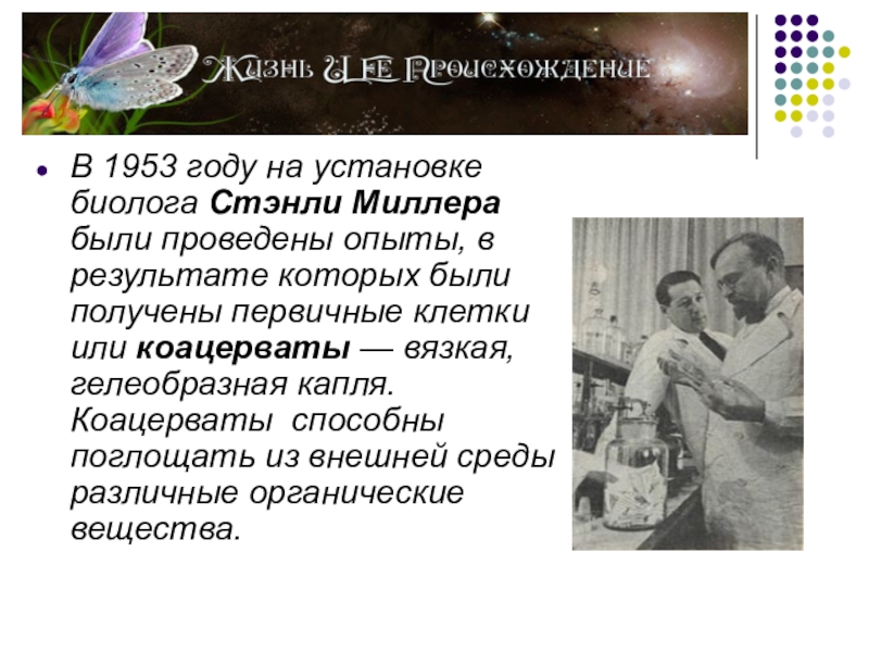 Слайд 18В 1953 году на установке биолога Стэнли Миллера были проведены опыты,