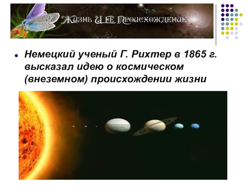 Слайд 13Немецкий ученый Г. Рихтер в 1865 г. высказал идею о космическом