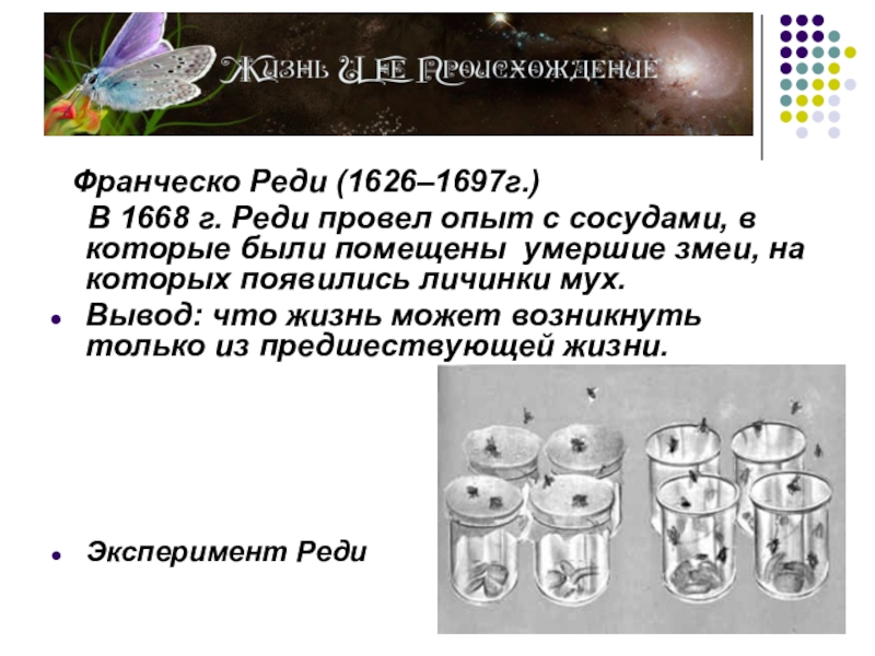 опыт с сосудами, в которые были помещены умершие змеи, на которых появились личинки мух.