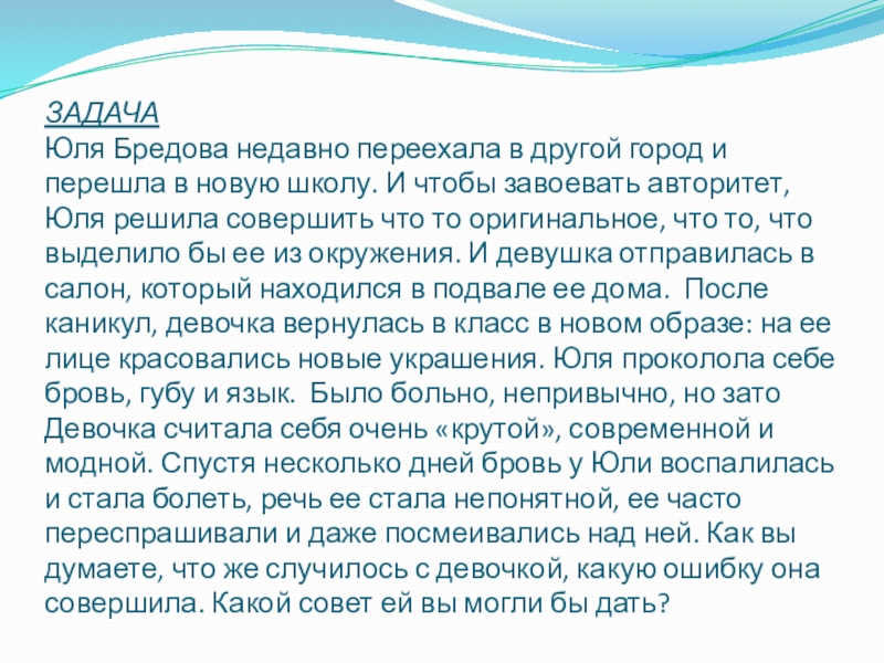 школу. И чтобы завоевать авторитет, Юля решила совершить что то оригинальное, что то, что выделило бы ее из окружения. И девушка отправилась в салон, который находился в подвале ее дома. После каникул, девочка вернулась в класс в новом образе: на ее лице красовались новые украшения. Юля проколола себе бровь, губу и язык. Было больно, непривычно, но зато Девочка считала себя очень «крутой», современной и модной. Спустя несколько дней бровь у Юли воспалилась и стала болеть, речь ее стала непонятной, ее часто переспрашивали и даже посмеивались над ней. Как вы думаете, что же случилось с девочкой, какую ошибку она совершила. Какой совет ей вы могли бы дать?