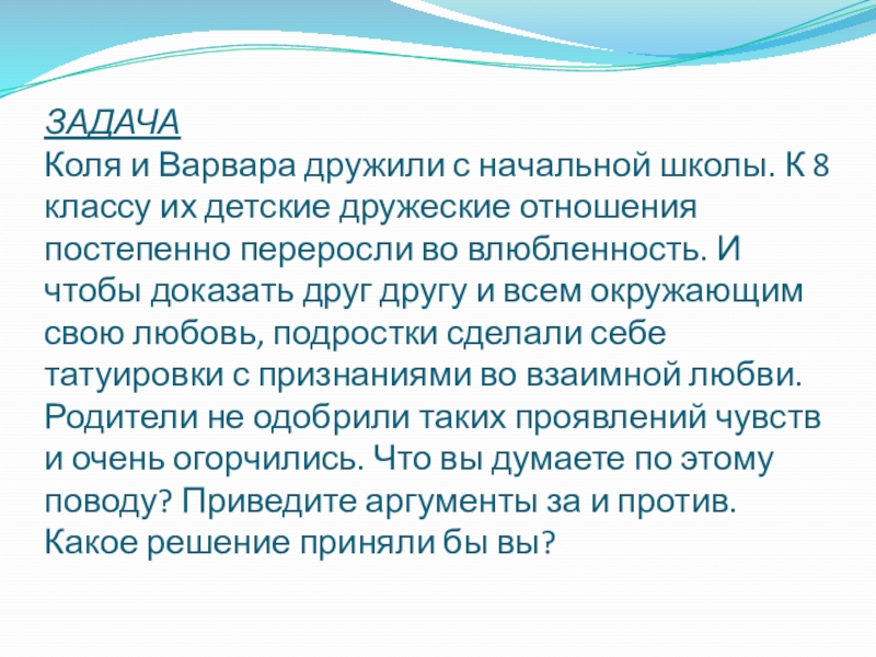 детские дружеские отношения постепенно переросли во влюбленность. И чтобы доказать друг другу и всем окружающим свою любовь, подростки сделали себе татуировки с признаниями во взаимной любви. Родители не одобрили таких проявлений чувств и очень огорчились. Что вы думаете по этому поводу? Приведите аргументы за и против. Какое решение приняли бы вы?