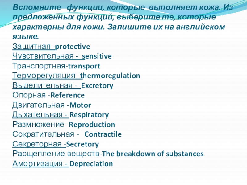Слайд 4Вспомните функции, которые выполняет кожа. Из предложенных функций, выберите те,