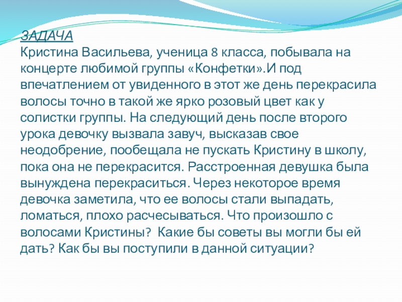 под впечатлением от увиденного в этот же день перекрасила волосы точно в такой же ярко розовый цвет как у солистки группы. На следующий день после второго урока девочку вызвала завуч, высказав свое неодобрение, пообещала не пускать Кристину в школу, пока она не перекрасится. Расстроенная девушка была вынуждена перекраситься. Через некоторое время девочка заметила, что ее волосы стали выпадать, ломаться, плохо расчесываться. Что произошло с волосами Кристины? Какие бы советы вы могли бы ей дать? Как бы вы поступили в данной ситуации?