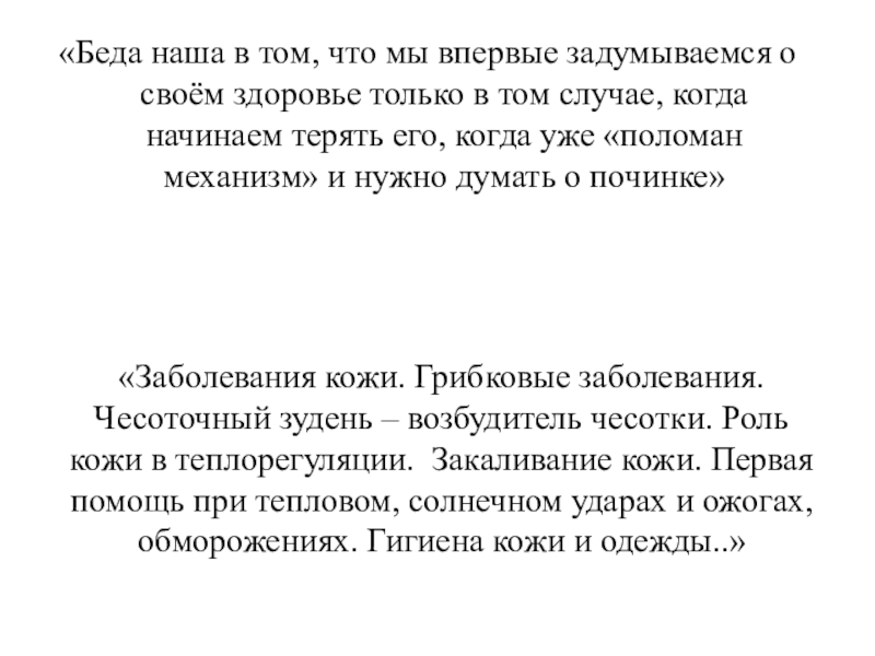 «Беда наша в том, что мы впервые задумываемся о своём здоровье только в том случае, когда начинаем терять его, когда уже «поломан механизм» и нужно думать о починке»