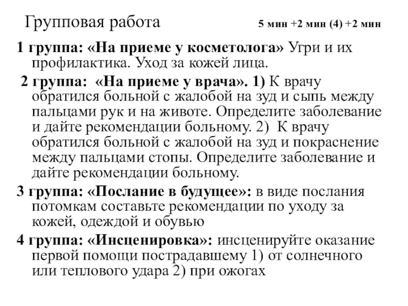 2 группа: «На приеме у врача». 1) К врачу обратился больной с жалобой на зуд и сыпь между пальцами рук и на животе. Определите заболевание и дайте рекомендации больному. 2) К врачу обратился больной с жалобой на зуд и покраснение между пальцами стопы. Определите заболевание и дайте рекомендации больному.