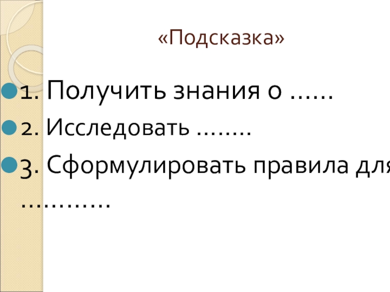 «Подсказка»1. Получить знания о ……2. Исследовать ……..3. Сформулировать правила для …………