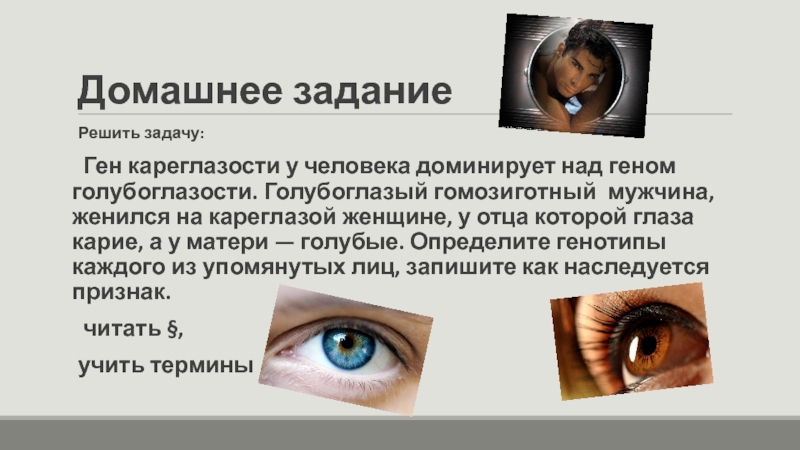 Домашнее заданиеРешить задачу:  Ген кареглазости у человека доминирует над геном голубоглазости. Голубоглазый гомозиготный  мужчина, женился на